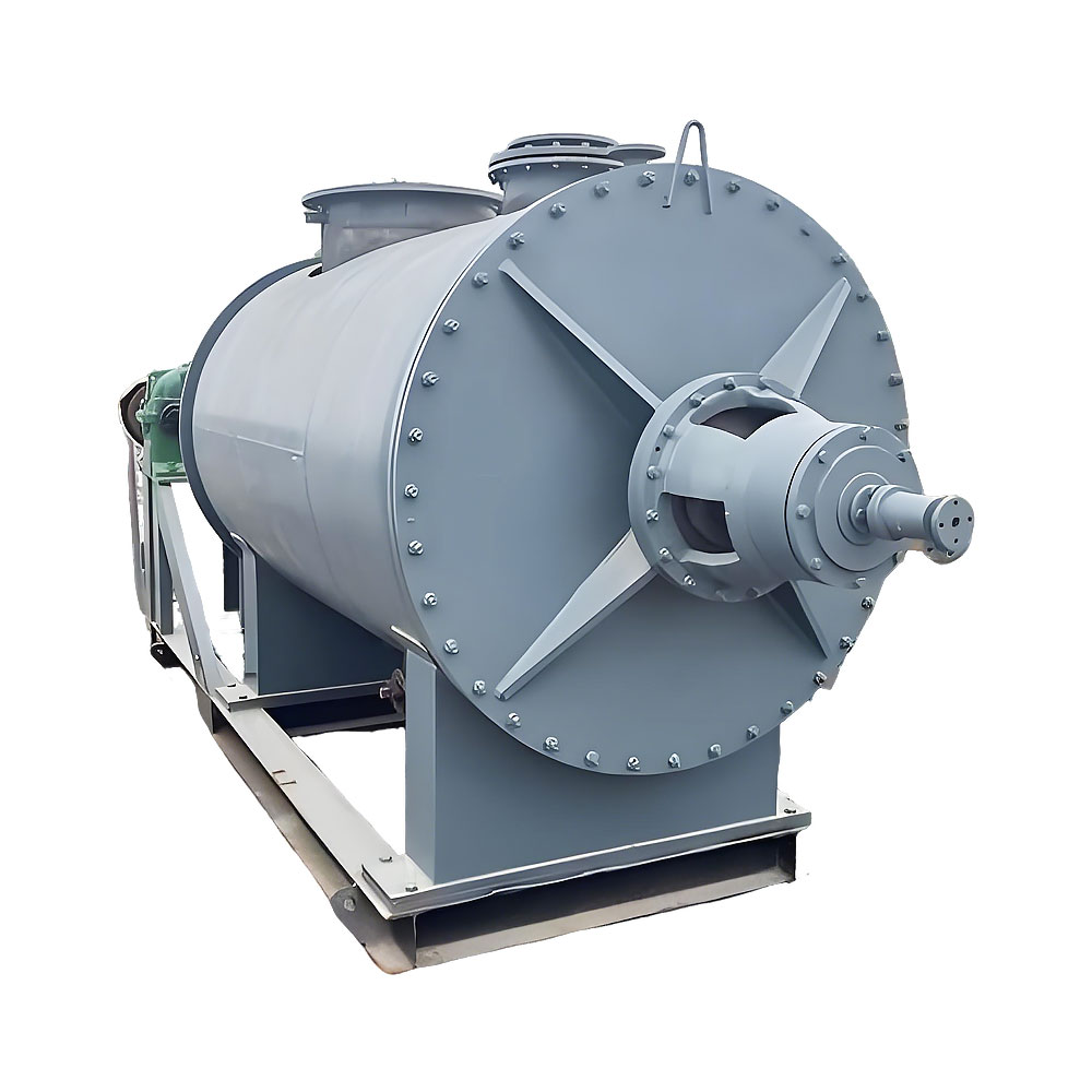 原理:被干燥物料從殼體上方正中間加入,在不斷正反轉(zhuǎn)動的耙齒的攪拌下,物料軸向來回走動,與殼體內(nèi)壁接觸的表面不斷更新,受到蒸汽的間接加熱,耙齒的均勻攪拌,粉碎棒的粉碎,使物料內(nèi)的水份氣化,在真空系統(tǒng)的作用下,使被干燥物料內(nèi)部水份和表面水份更有利的排出,氣化的水份經(jīng)干式除塵器、濕式除塵器、冷凝器,從真空泵出口處放空。